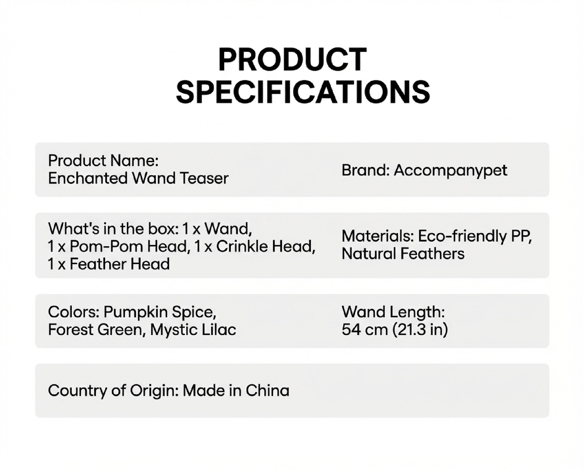 Keep playtime fresh and exciting! This set includes one wand and three unique, interchangeable heads: a crinkly Crinkle Head, a fluffy Feather Head, and playful Pom-Pom Head. Simply switch them out to prevent boredom and discover your cat’s favorite way to play.