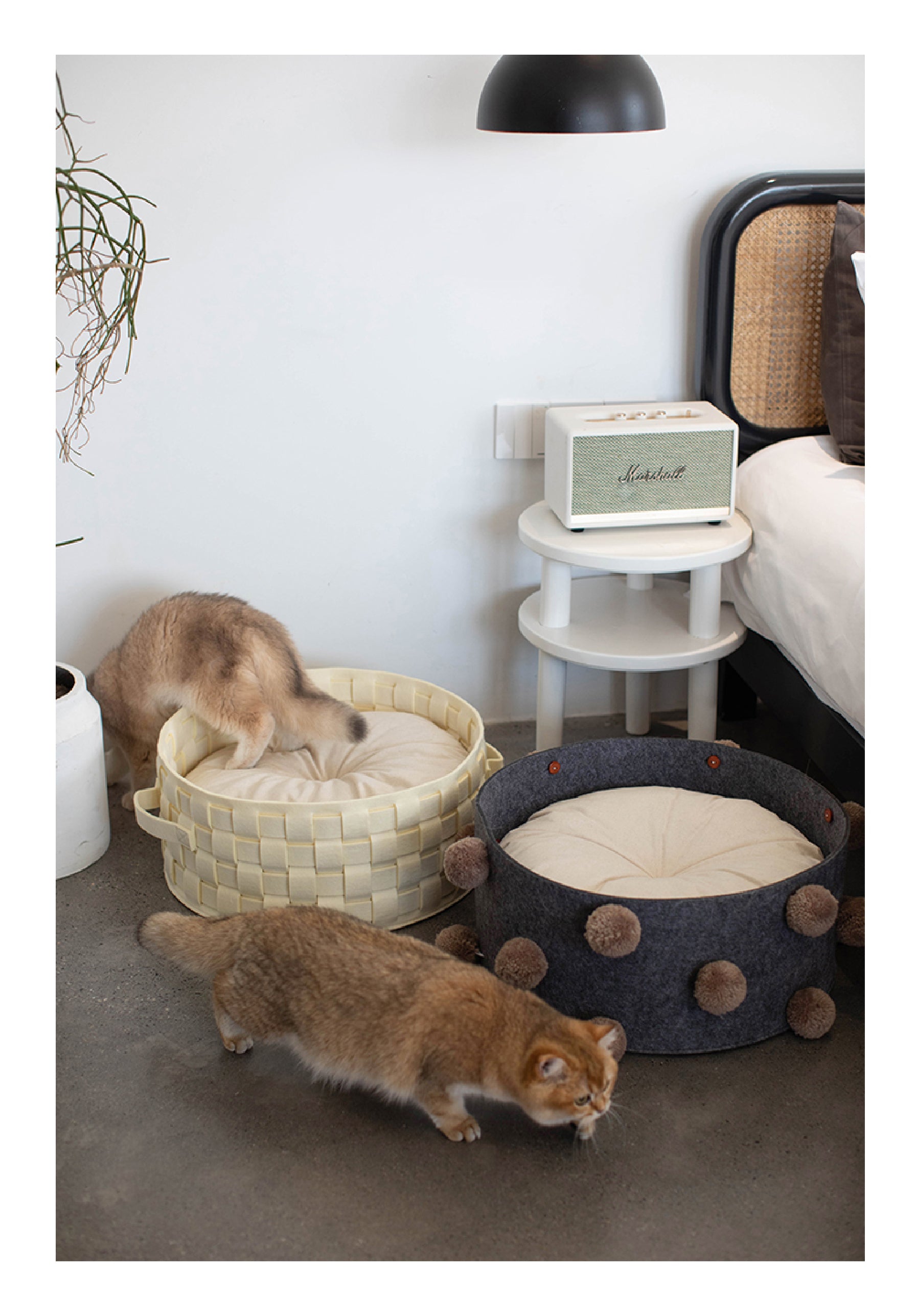 Finally, a pet bed that looks as good as it feels. Our Modern Woven Felt Bed is designed for the discerning pet and their style-conscious owner. Meticulously crafted using an artisanal basket-weave technique, this bed is a stunning statement piece that seamlessly blends with your home decor. It's more than just a place to sleep—it's a private, cozy retreat where your best friend can feel safe, comfortable, and truly at home.