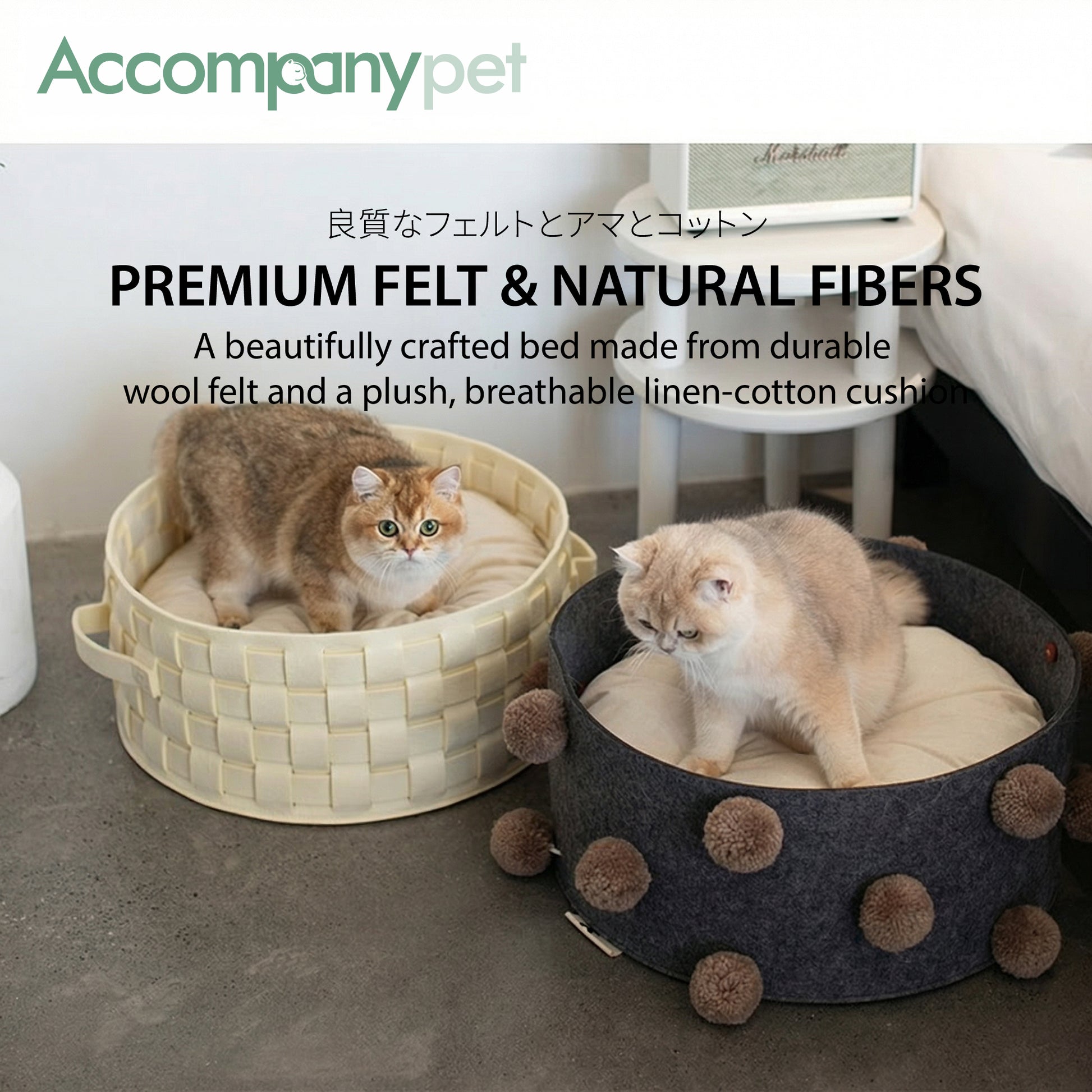 The basket is crafted from durable, high-quality wool felt, while the inner cushion is made from a plush and breathable linen-cotton blend. Both materials are natural, non-toxic, and gentle on your pet’s skin and fur.